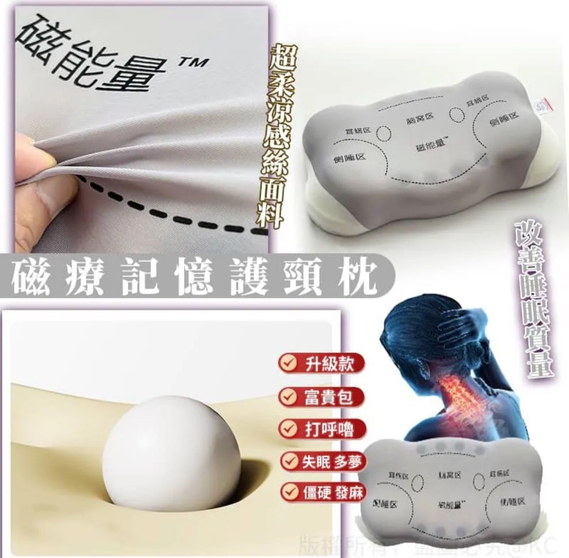 磁療記憶護頸枕 $69/個,2個或以上$59/個 磁療記憶枕通過磁場調節改善睡眠品質,緩解頸椎壓力,適合追求健康睡眠的人群。 核心功能: 磁療記憶枕內置磁石產生穩定磁場,促進頭部及頸部區域血液迴圈,緩解肌肉緊張與疼痛,對因頸椎問題導致的失眠有一定改善作用。磁場還能調節神經系統,幫助恢復規律睡眠。 當普通枕頭讓頸椎懸空成直角,磁療記憶枕的科學高度悄然托起生理曲度。棉與氨綸的黃金配比像會呼吸的網,滌綸骨架穩穩承托卻不生硬,仿佛有雙溫柔手在深夜為您調整睡姿。那些落枕後歪著脖子開會的尷尬清晨,終於能變成自然醒時的神清氣爽。 【材質】面料:A類超柔涼感絲面料 【面料手感】柔軟,舒適,輕薄,透氣,冰涼 【尺碼】30*60*10CM