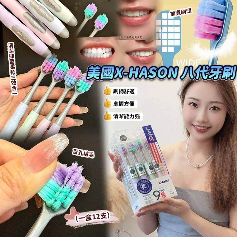 美國 X-hason 八代牙刷 (1盒12支) $55/盒,2盒或以上$45/盒 📦預計貨到日: 12月中旬 ✅超軟毛植毛 ✅清潔面提高240%,刷毛孔數為普通刷頭的2.5倍 ✅增大與齒面接觸面積,清潔更到位,牙刷刷柄人體力學 ✅牙刷既不會太硬令到牙齦出血 ✅也不會太軟,刷得不夠乾淨 ✅刷毛回彈力強,比其他牙刷使用壽命更長 -規格:1盒12支 -產地:中國