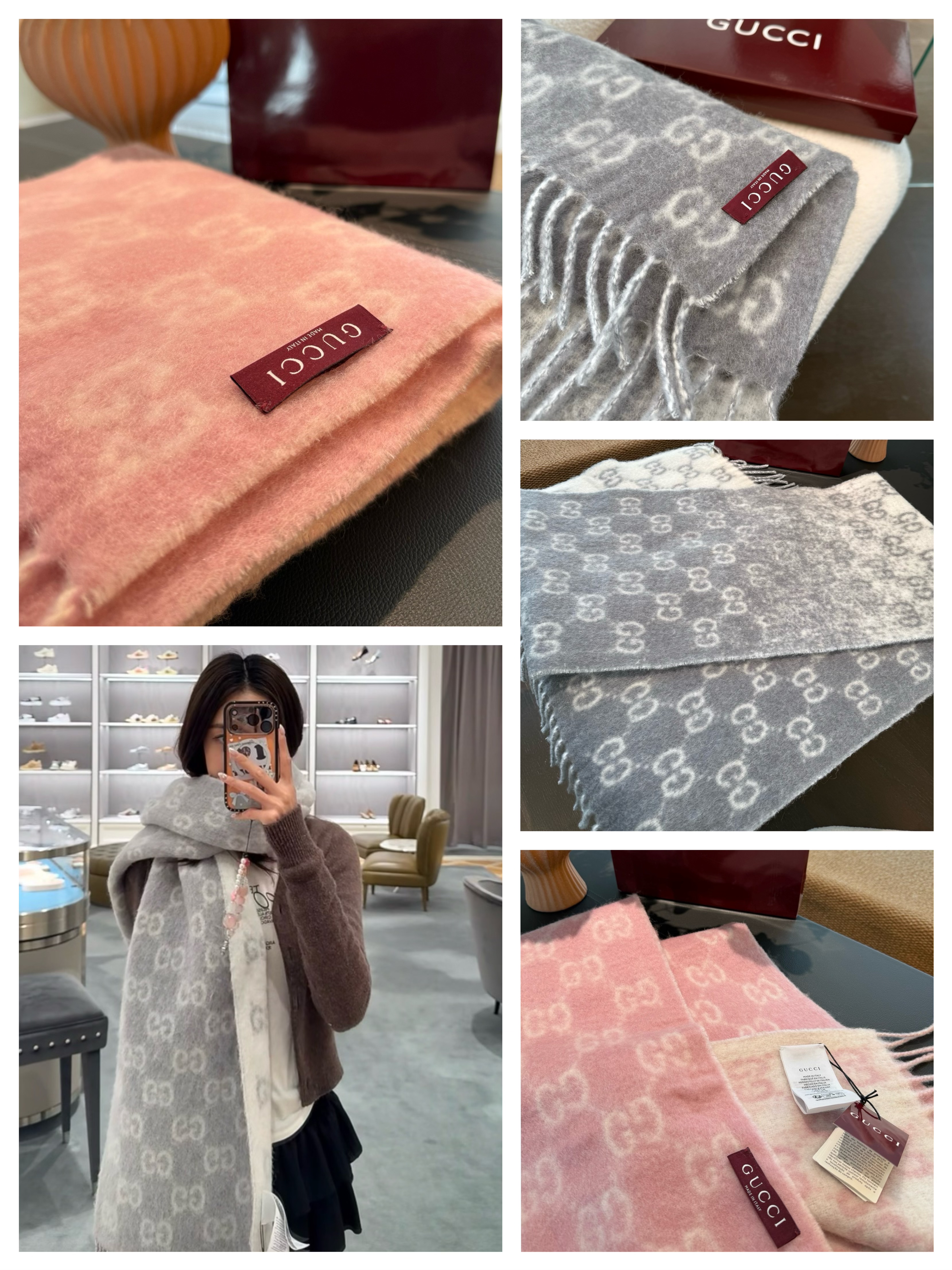 聖誕🎄限量 oulet Gucci 25/12整個靚靚價😱😱機會黎啦 Gucci漸變色圍巾🧣$1225 售完即止‼️ 羊駝毛混紡面料 流蘇滾邊 200(長)x37(寬)cm 顏色: 灰色/粉色