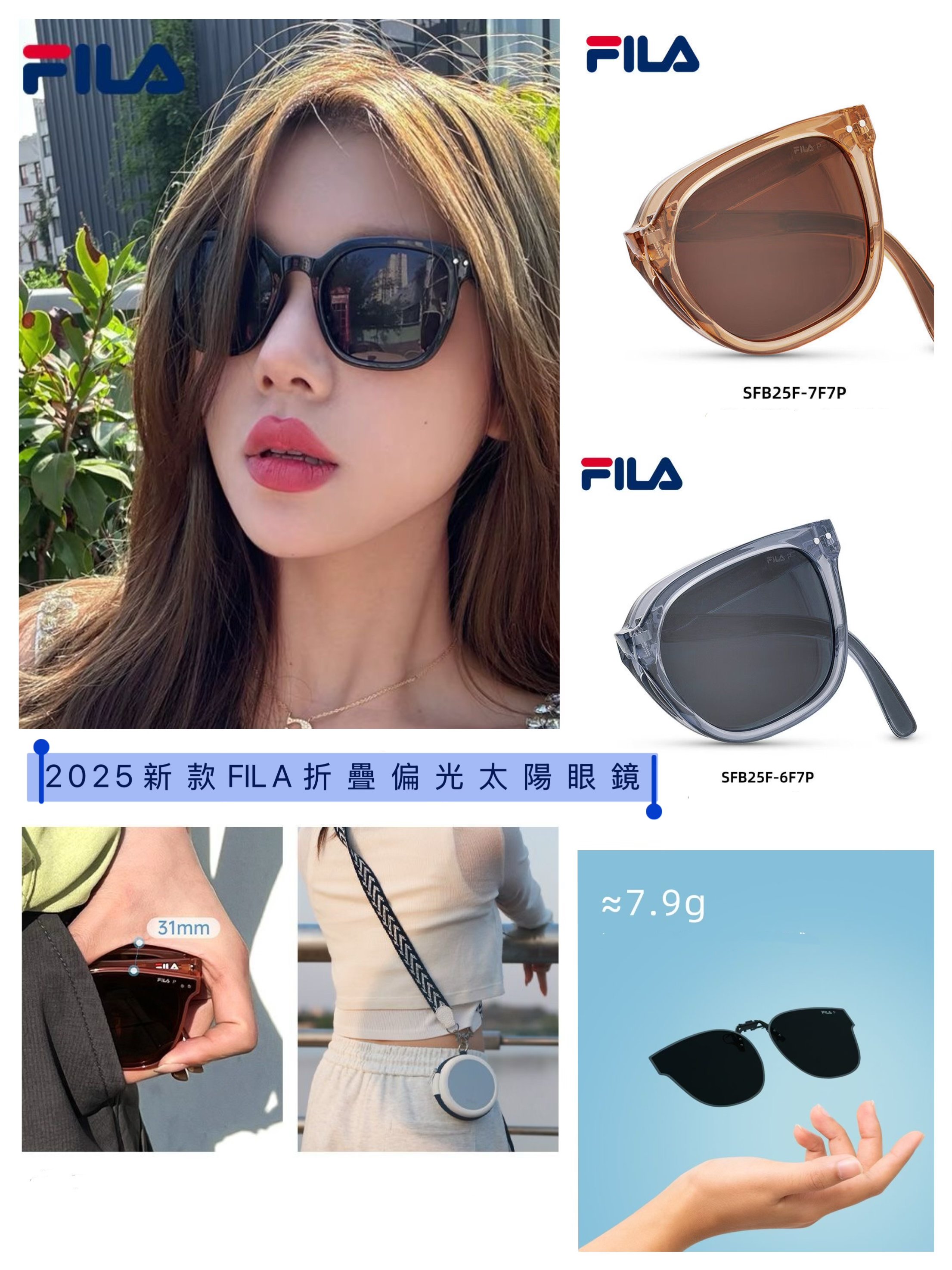 2025新款 FILA折疊偏光太陽眼鏡 $298/副 男女同款 真正超輕超薄 只有19.3g 摺疊後33mm 多種防滑設計 氣墊鼻托,不易掉落 顏色:黑色/灰色/焦糖色 配圓形收納盒