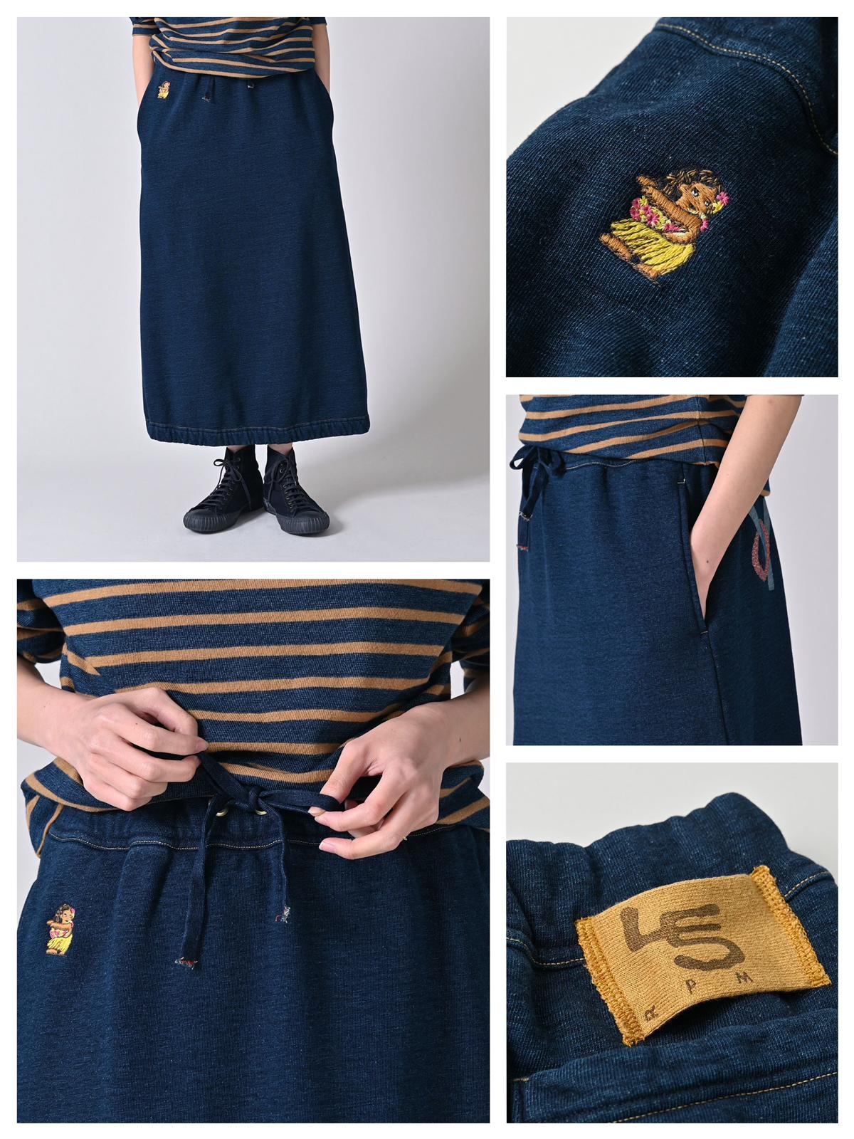 45r刺繡kaya半裙 $338 棉花和紡紗 竹節+平紗+內圈 面料側微起絨 配套雙紗混紡微粗針羅紋 前刺繡印花 後面側印花刺繡 棉100% 靛藍色 Free size 裙長81腰圍72可調臀圍102