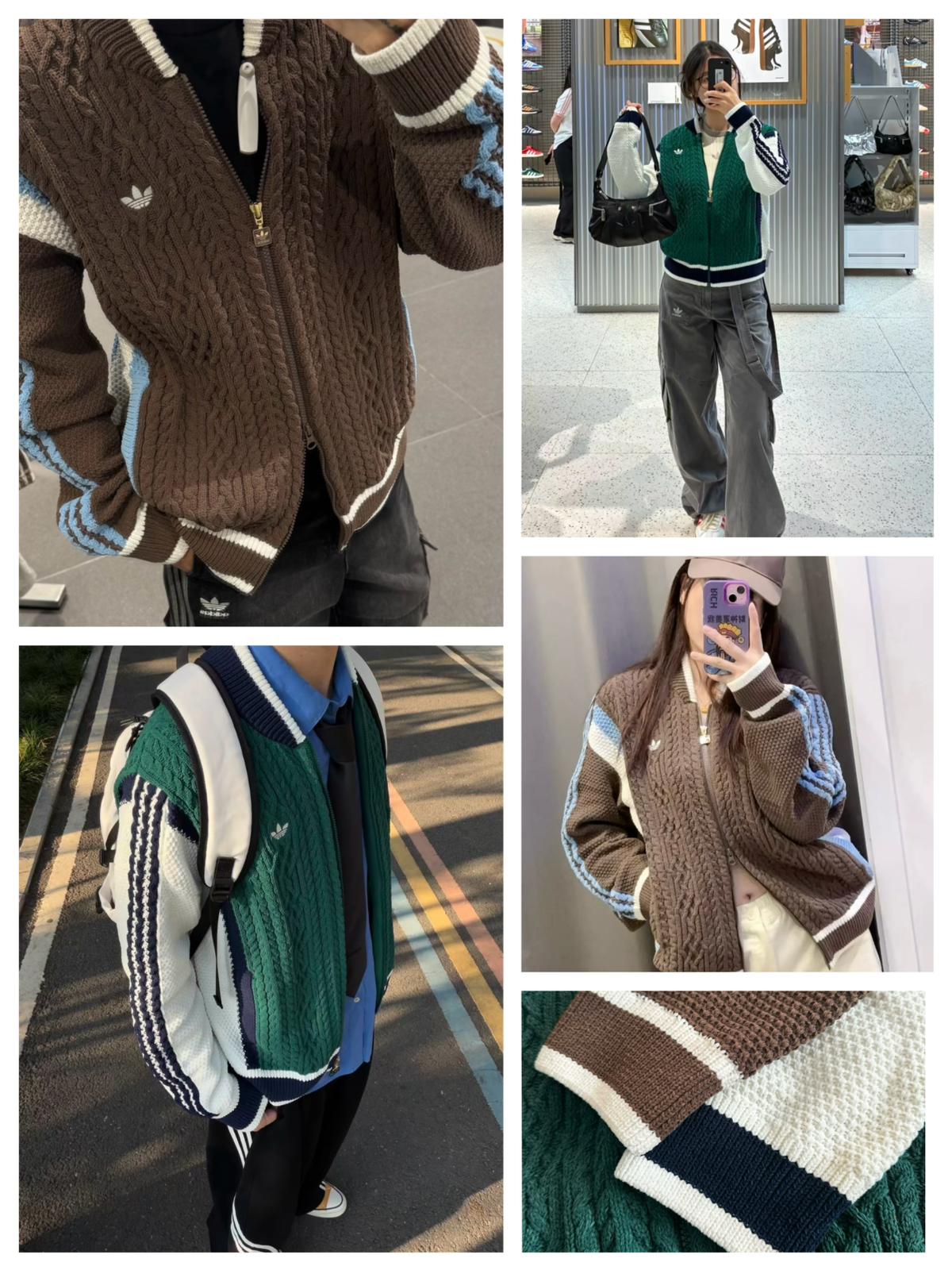 Adidas學院風拼接毛衣開衫 $399 啡色/綠色 S-XL S碼衣長60胸圍50袖長60 M碼衣長62胸圍52袖長62 L碼衣長67胸圍56袖長64 XL碼衣長70胸圍58袖長66