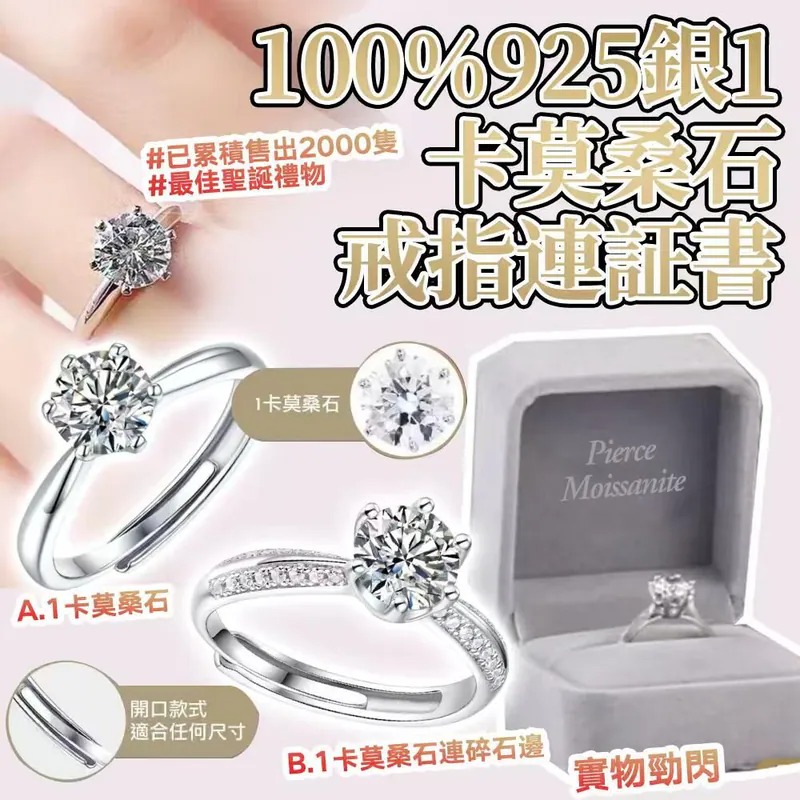 Atelier Moistassine 100% 925銀1卡莫桑石戒指連証書 A)1卡莫桑石$88 B)卡莫桑石連碎石邊$108 ❌截單日期:2025/10/28 📦預計貨到日:12月下旬 #已累積售出2000隻 👏👏 實物勁閃😻😻大大粒✨✨ 亞馬遜,香港全部都要 600-700蚊隻~~ 美國🇺🇸原價$6XX🙀🙀 今日限時勁減🪓🪓 超級超級優惠, 低至$88隻 買到就賺到😎😎 香港賣緊925 莫桑石要成千架~~ 真真真係好閃呀!! 🤩🤩 買黎襯衫或送比人都咁正🙀🙀 高品質嘅莫桑石配925純銀 1卡勁大粒, 大方又高貴 女仕們見到一定心動😍 唔係成日有得減, 趁依家咁抵 🦾🦾掃定幾當禮物送比人啦🎁 開口款式適合任何尺寸~ 規格: 1卡六抓莫桑石 925 銀托