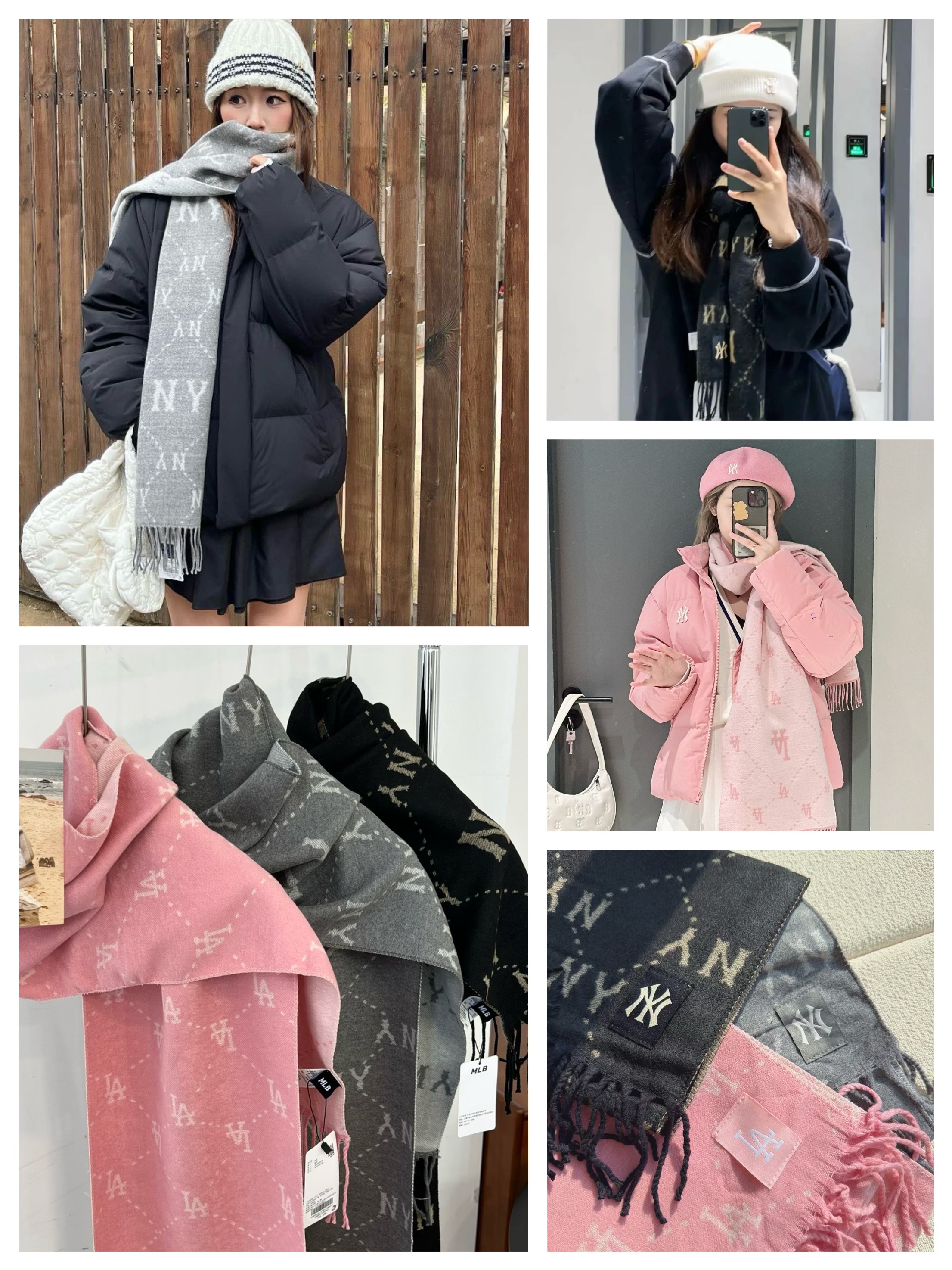 供應商清貨,只有簡單包裝📣📣優惠出 MLB雙面滿印羊毛頸巾 $258/條 採用 30%綿羊毛 🦙70%晴綸 含羊毛 上手軟軟的~ 有一定厚度🫶🏻不是薄款❌ 輕盈 蓬鬆 保暖性好 雙面logo提花工藝 兩種戴法 兩種風格✌🏻 3色 顏色:粉色、淺灰、黑色 173*32cm