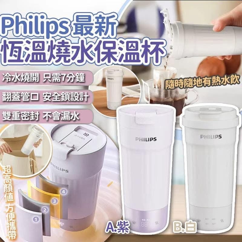 Philips 飛利浦限定薰衣草粉紫色恆溫燒水保溫杯 $158個 📦11月下旬到 低至$158個!!!! Philips 飛利浦限定薰衣草粉紫色恆溫燒水保溫杯 #紫色勁靚 近期🔥大熱🔥嘅產品之前有媽媽想搵🙋🏻♀ 而家問咗供應商可以開團👏🏼👏🏼 輕量便攜去旅行都好啱用💯 有時想喺酒店🏨食個杯麵🍜或沖奶🍼 但唔想用酒店個水煲🙅🏻♀ 就可以用呢個燒水杯煲水🔥衛生又方便🉐 冬日必備 超高顏值 方便攜帶 出行隨時隨地有熱水飲♨ 外出旅遊住酒店好幫手👍! 450ml容量 接近普通水杯大小 冷水燒開 只需要7分鐘⏰ 帶有雙重密封 翻蓋管口帶有安全鎖設計 隨意擺放在手袋裡都不會漏水💦 適配100-240V電壓 多國家可用 燒水/保溫/恆溫/調溫🌡四種用法 可選擇四檔加熱溫度 100℃/85℃/55℃/45℃ 斷電保溫長達6小時 重量:450g 容量:400ml 尺寸:92mm*201mm*70mm