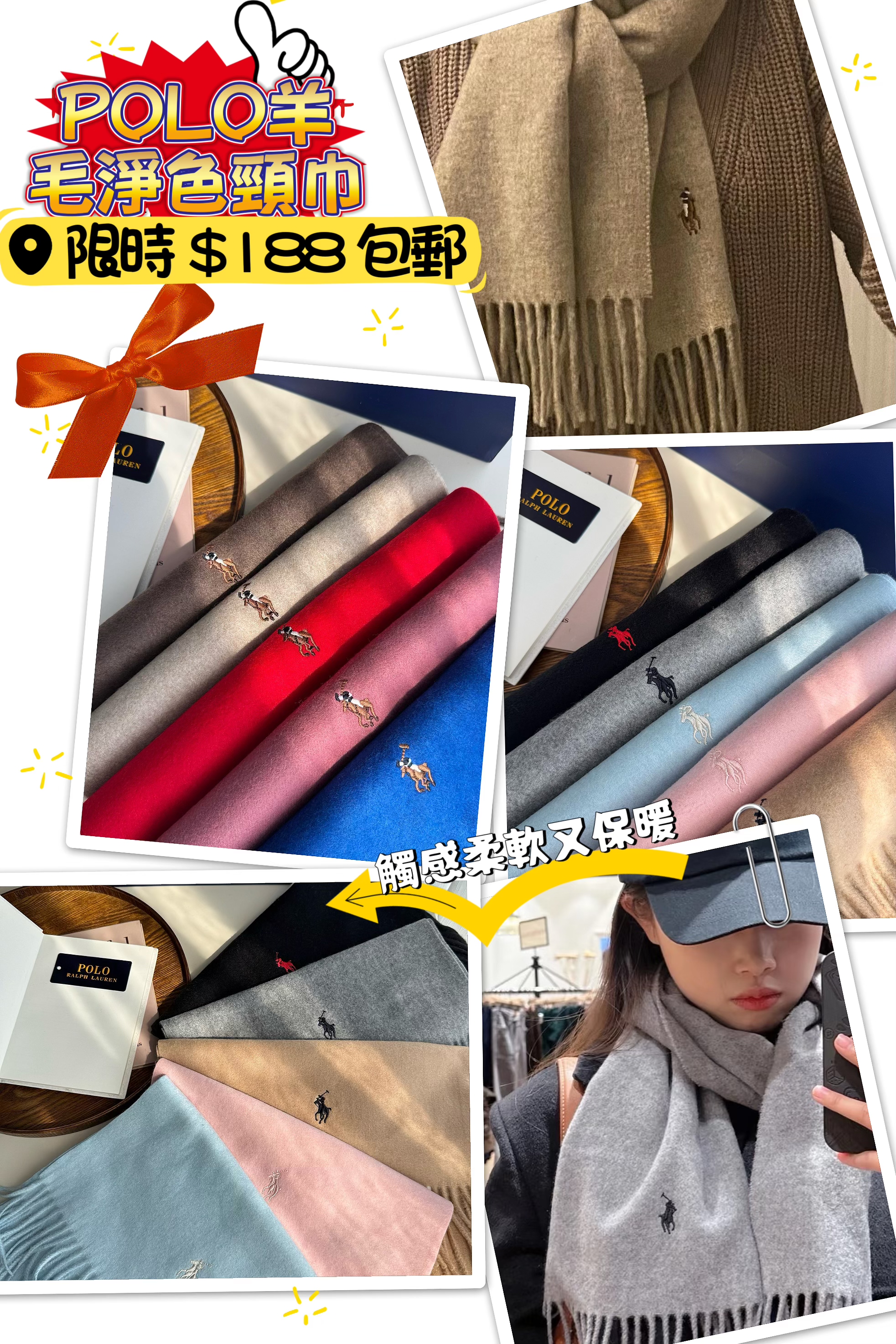 今期必買📦限時3日包郵優惠 $188/條‼️ 秋冬限定!大熱回歸嘅靚頸巾返黎啦!今年仲出左新色呀! 韓國熱賣🔥每個人都必備嘅RL POLO羊毛淨色頸巾😎!!超級柔軟,觸感舒服到不得了😍 呢款R*L PO*LO羊毛頸巾,真係適合所有年齡層🌟,不論男女老少,都啱戴👨👩👧👦!可以同男友、老公、小朋友、媽媽、爸爸一齊共用,增添家庭溫馨感💕 絕非市面上常見嘅聚酯纖維,而是實實在在嘅羊毛質地 呢條頸巾嘅手感好到爆炸💥,一摸上手就放唔低,更唔洗講戴住係頸,溫暖你整個冬天啦☃️!立即擁有佢,一齊享受冬日裏的暖意與時尚🎉! 成分:80% 羊毛,20% 尼龍 尺寸:35✖️185 cm *包郵不設夾單
