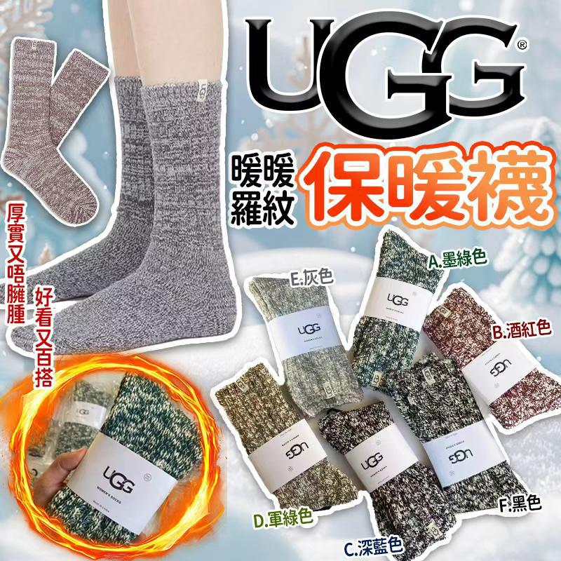UGG暖暖羅紋保暖襪(1套2對) $55/套,2套或以上每套$45 ☃️❄#冬天必入手 🧦🧦 低至 $22.5對👏👏 👵🏼👩🏻👧🏻無論任何年齡 💪🏼冬天一定要好好保暖呀‼️ 🦶🏻🧊如果對腳長期冷冰冰,🧦快啲著返對UGG 襪,🥰🥰咁就即時暖到入心‼️ 🔥🔥UGG襪長期熱賣,☁️☁️非常保暖,☃️❄🌨所以好多朋友鍾意著住去雪地,🉐️🉐️厚實又唔臃腫,顏色款式又夠潮,😍可以靚靚地保暖‼️ 🌟色彩繽紛,天天不同款 👍好看又百搭 👍厚身中筒襪 🌈6色選: A)墨綠色 B)酒紅色 C)深藍色 D)軍綠色 E)灰色 F)黑色 材質:棉+彈性纖維 Free size: 35-39