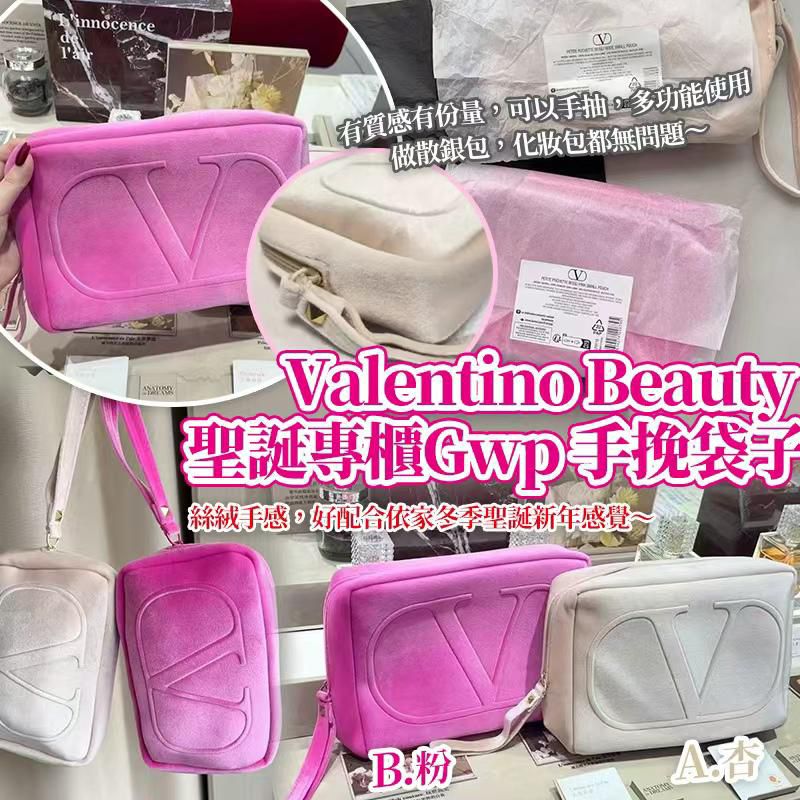 Valentino Beauty聖誕專櫃Gwp手挽袋子 $78/個 #原裝專櫃 供應商限量,數量十分有限~ 勁有質感~~市面已無貨 已係炒價要 $3xx ✴️絲絨手感,好配合依家冬季聖誕新年感覺~ ✴️有型有款,仲有粒品牌signature 既釘架~ 有質感有份量,多功能使用,可以手抽,做散銀包,化妝包都無問題~ 顏色: A)杏色 B)粉色 尺寸:16*10*4cm